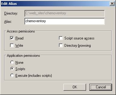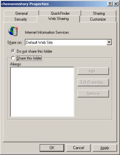 Once IIS is installed, open the chemoventory web directory and share the directory. (XP and in some windows 2000 it is possible). In IIS windows XP right click and select sharing and security, you will see the window below.